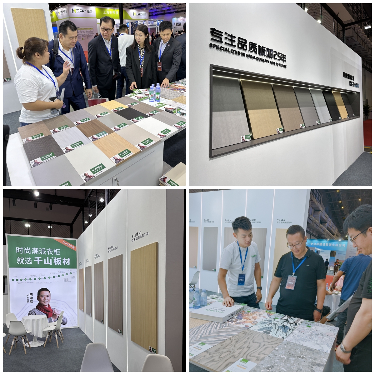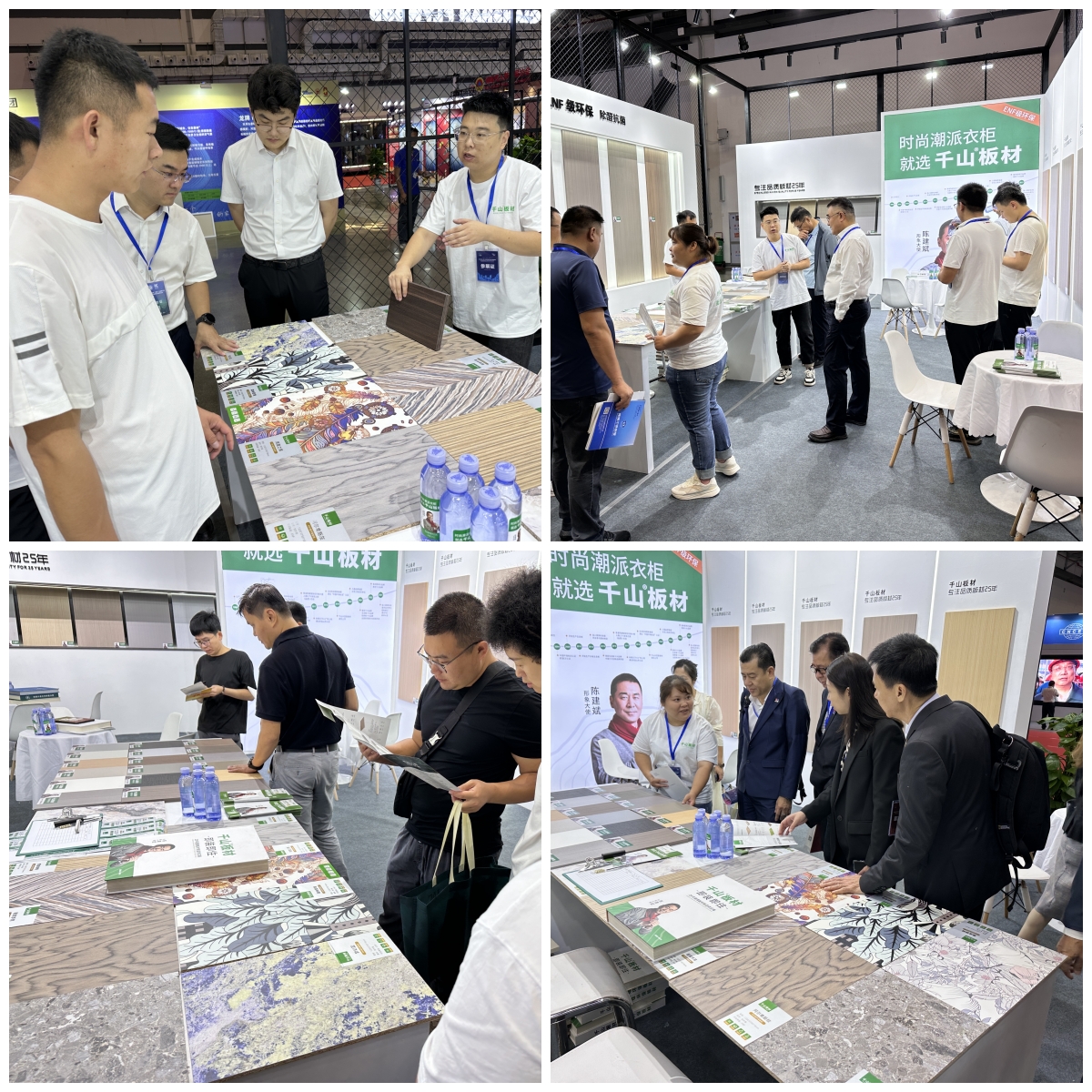 為更好的服務(wù)個性化定制和高端用戶的需求,滿足多樣化的家裝場景,千山在此次展會現(xiàn)場新推出了19款高定系列板材,表面花色采用數(shù)碼打印,環(huán)保等級為ENF級,吸引了諸多觀展客戶前來洽談咨詢。