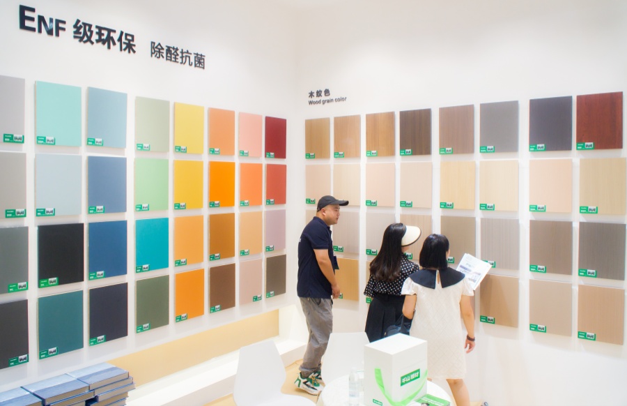 千山板材展館以6大系列花色矩陣呈現(xiàn),分為6大展區(qū):木紋系列32款,純色系列41款,布紋石紋系列8款,高定系列10款,數(shù)碼系列24款,門板系列12款,127款潮流花色詮釋千山板材對于時尚家居的探索和引領(lǐng)。