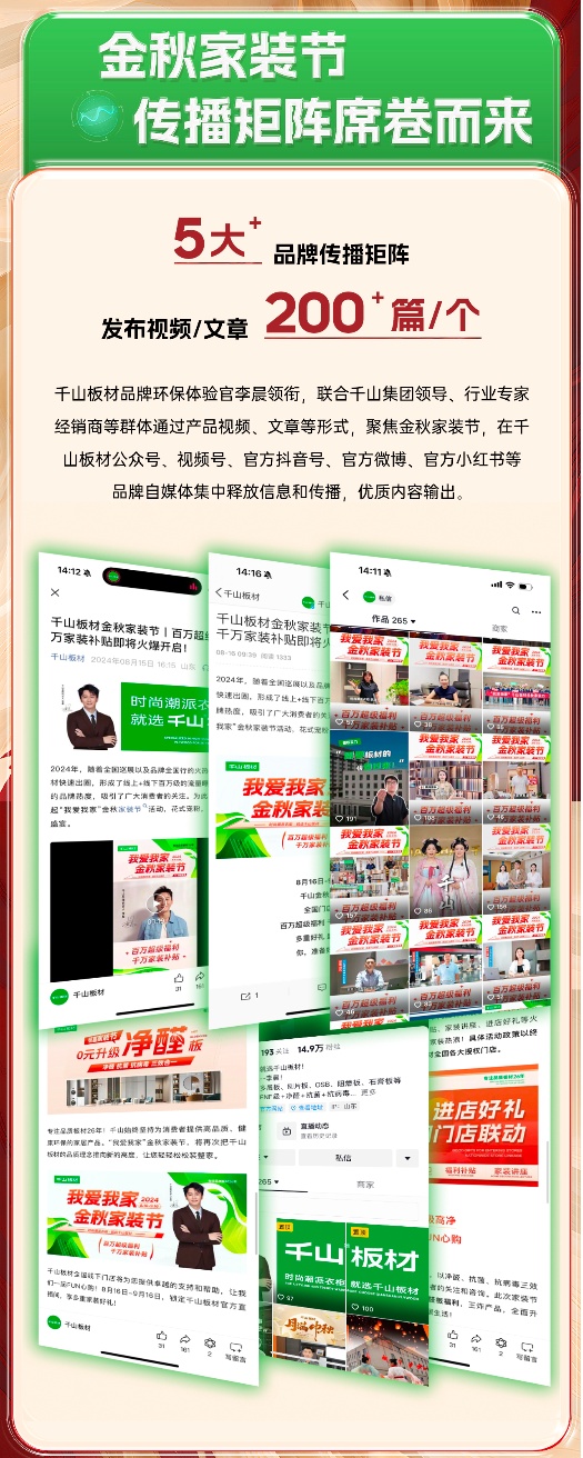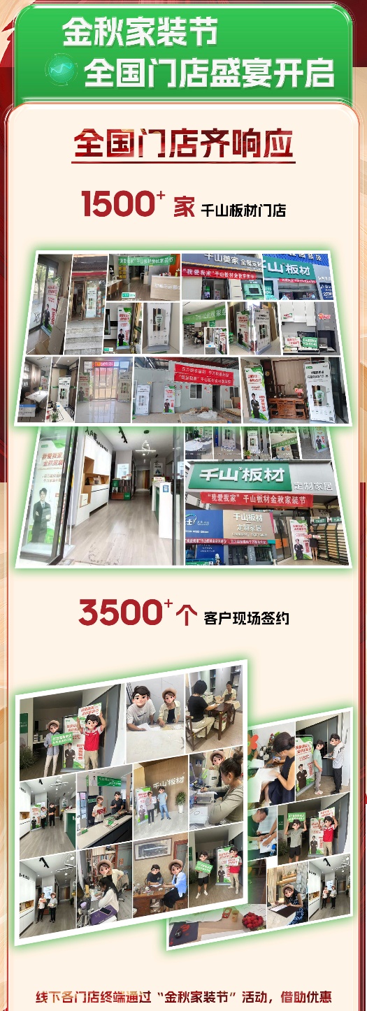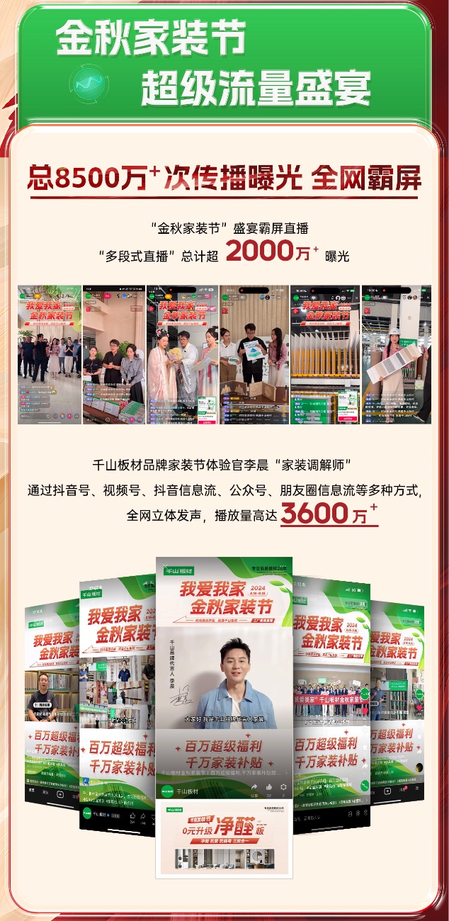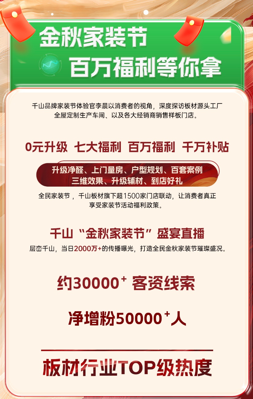 8月16日,千山金秋家裝節(jié)火爆上線,截至9月16日,為期30天的家裝節(jié)活動日前正式落下帷幕。活動期間,千山板材全國1500+門店聯(lián)動,全網(wǎng)曝光量超8500萬、線上直播觀看量超2000萬、簽約數(shù)量達3500+,實現(xiàn)了品牌聲量和銷售業(yè)績的雙豐收!