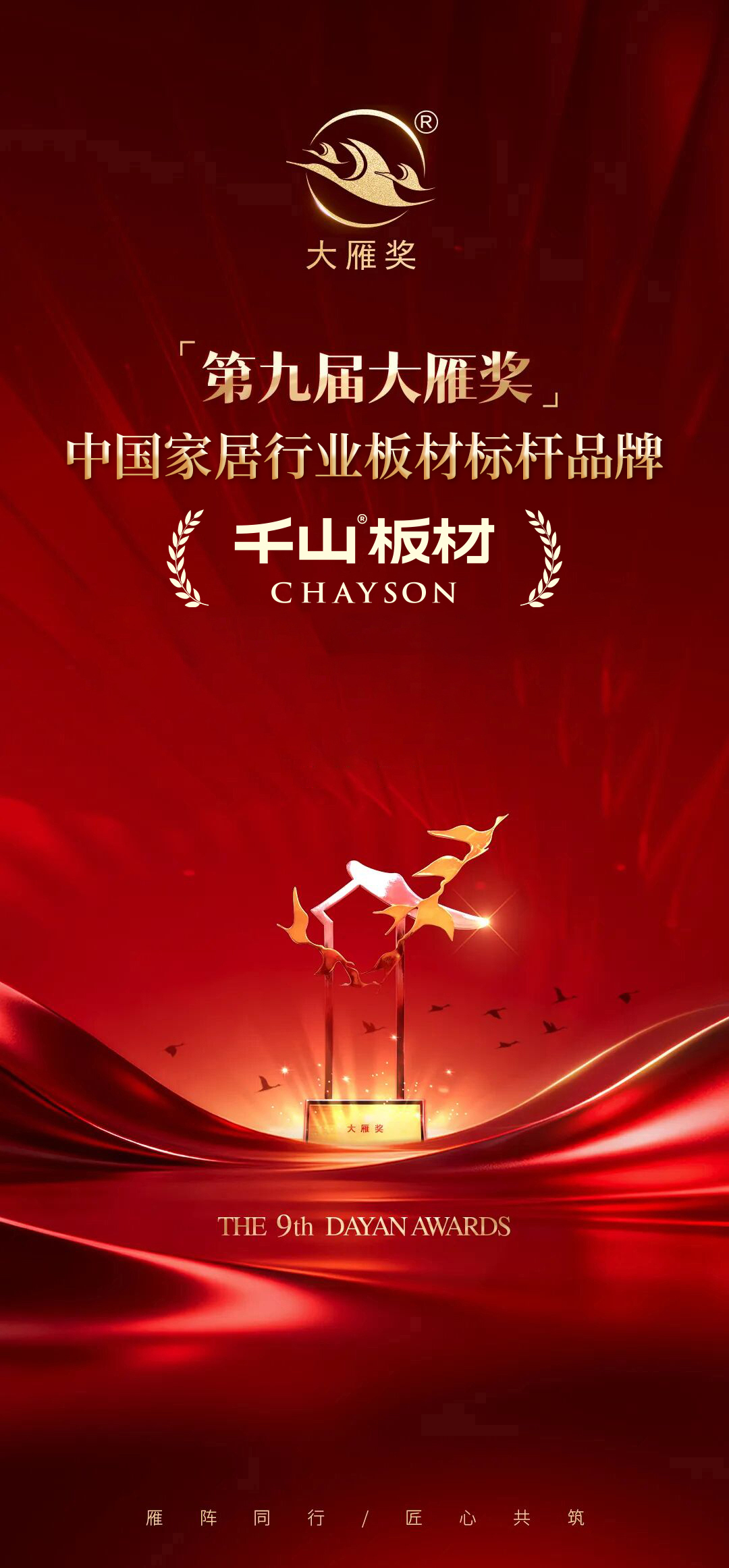 榮譽(yù)加冕,亦是全新起點(diǎn)。此次摘得大雁獎(jiǎng),是行業(yè)與市場對千山板材的雙重肯定,更是其持續(xù)前行的動(dòng)力。未來,千山板材將繼續(xù)堅(jiān)守 “高質(zhì)價(jià)比” 定位,深耕技術(shù)研發(fā)與產(chǎn)品創(chuàng)新,與行業(yè)同仁攜手同行、匠心共筑,以硬核實(shí)力推動(dòng)板材行業(yè)品質(zhì)升級,持續(xù)助推中國家居產(chǎn)業(yè)高質(zhì)量發(fā)展,為千萬家庭打造理想家!