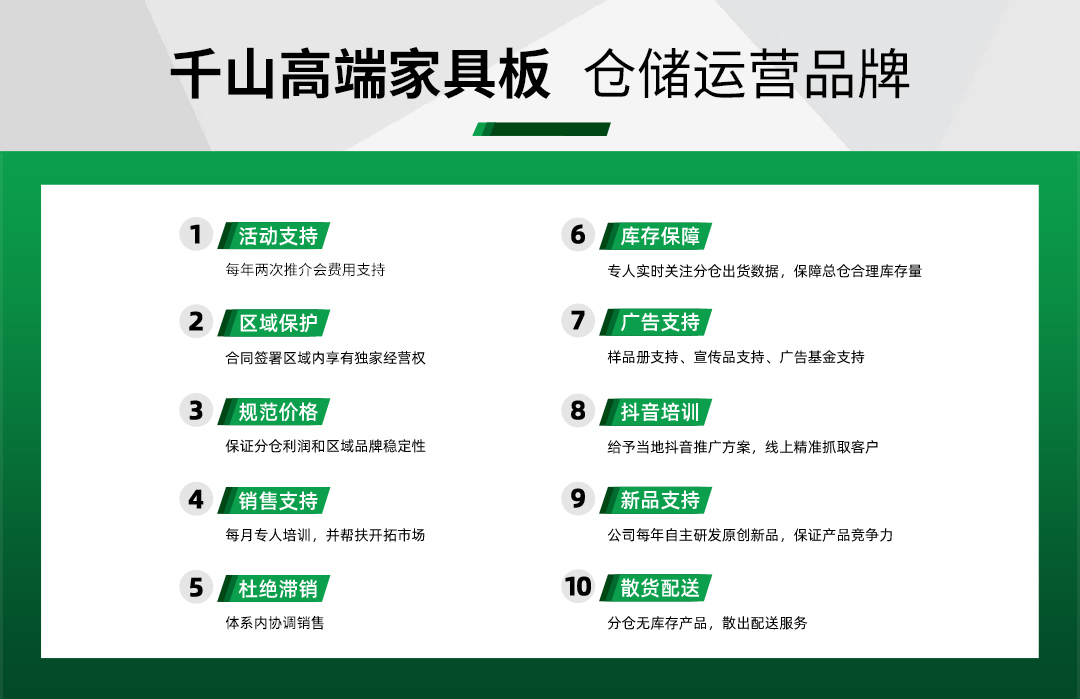“讓更多家庭擁有健康生活”是千山始終不變的初心與使命。在如今的新趨勢下,千山將繼續(xù)專注品質追求,不斷技術創(chuàng)新,提升服務質量,并積極擁抱更多的合作伙伴。2022千山家具板倉儲全國招商正式開啟,誠邀加盟!