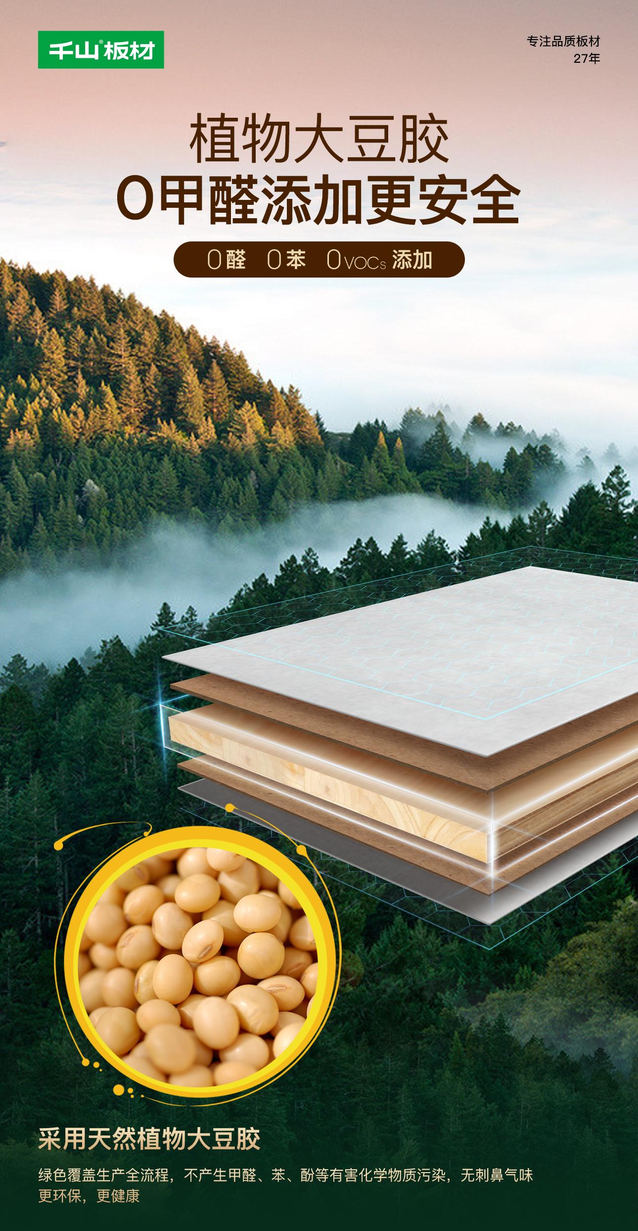 2019年千山憑借敏銳的市場(chǎng)洞察力,成功推出了大豆膠板材這一創(chuàng)新產(chǎn)品,并率先上市,迅速在市場(chǎng)上引起了廣泛關(guān)注與熱烈反響,引領(lǐng)行業(yè)進(jìn)入植物豆膠新時(shí)代。 自2019年成功上市以來,千山大豆膠板材以無醛大豆膠黏劑技術(shù)、優(yōu)質(zhì)實(shí)木板芯以及無醛添加制造工藝,在無醛人造板市場(chǎng)脫穎而出。憑借卓越的產(chǎn)品品質(zhì)與環(huán)保性能,
