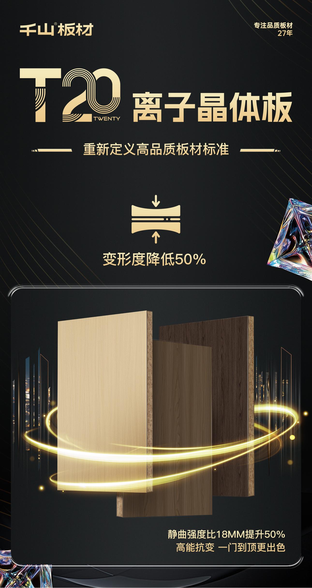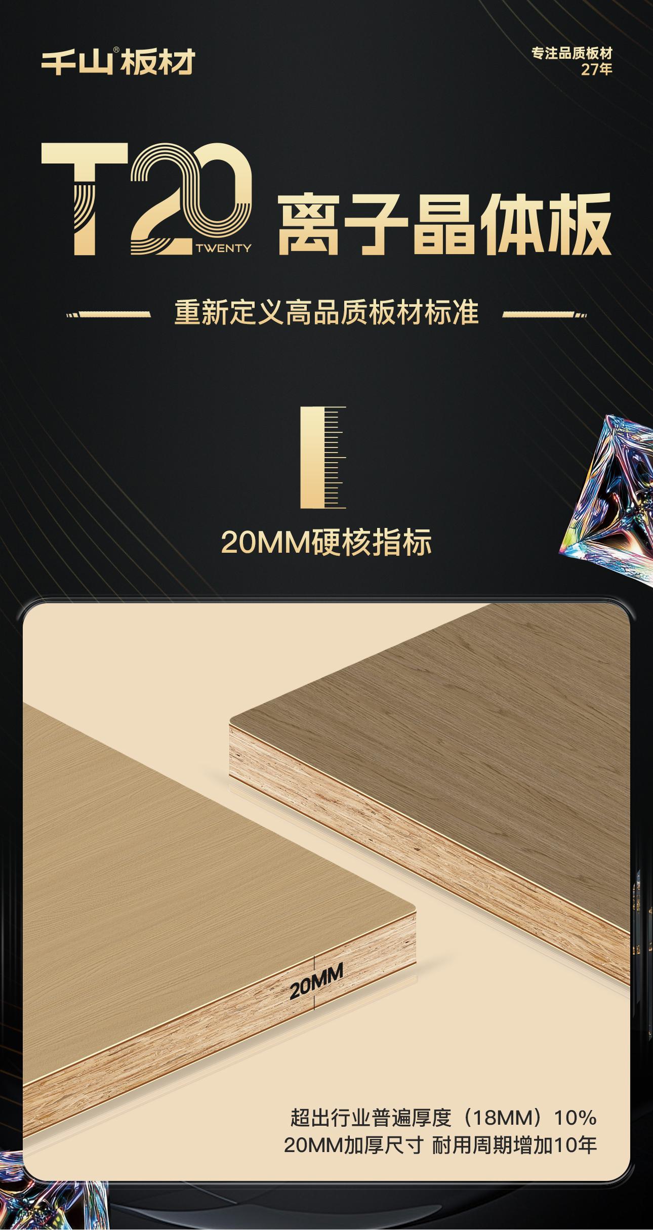 T20離子晶體板:是表面覆有離子晶體層,板材承重比常規(guī)18mm提升50%,變形度降低50%,耐磨性能提升3倍以上的20mm高端飾面板材。T20離子晶體板是千山板材推出的高端飾面板材,由千山集團與南京林業(yè)大學材料科學與工程學院聯(lián)合研發(fā),于2025年4月18日在臨沂全屋定制展首次發(fā)布,定價1099元/㎡,旨在為消費