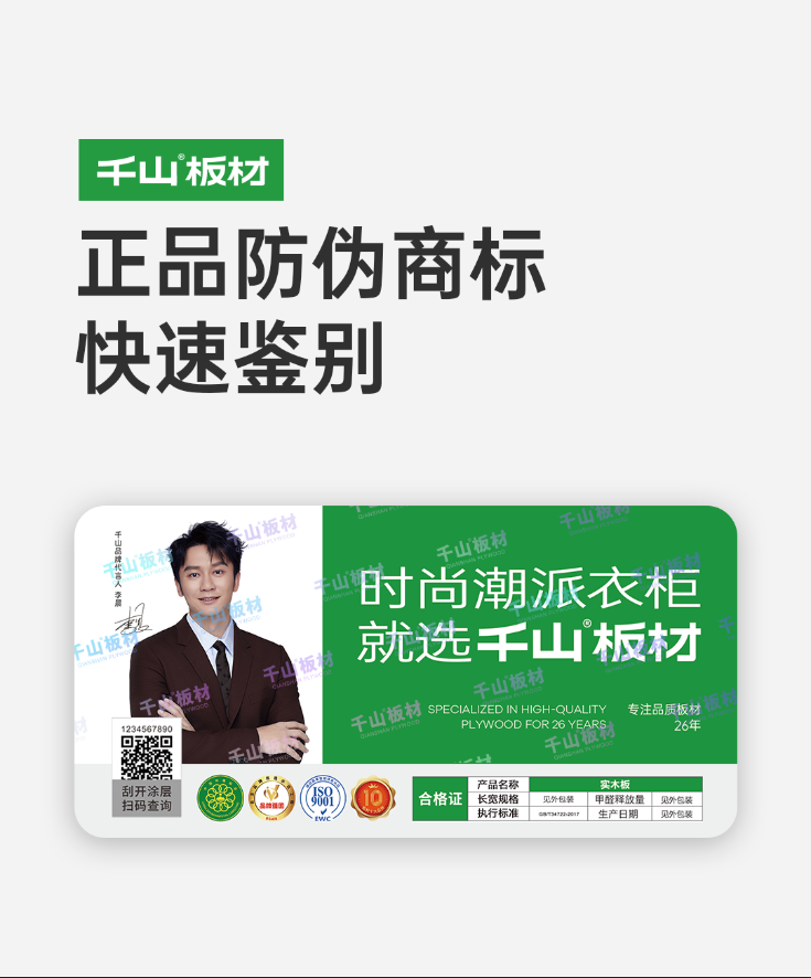 嚴(yán)控質(zhì)量標(biāo)準(zhǔn),捍衛(wèi)消費者權(quán)益,千山板材一直致力于為消費者提供優(yōu)質(zhì)的產(chǎn)品和服務(wù)。千山板材通過不斷優(yōu)化精進防偽設(shè)計,來抵制假冒偽劣產(chǎn)品。今天,千山板材防偽攻略特別上線,為您的安心保駕護航!01 查防偽商標(biāo) 正品千山板材均有可鑒別、可查詢的防偽商標(biāo)及防偽編碼,刮開二維碼涂層,微信掃描二維碼,即可查
