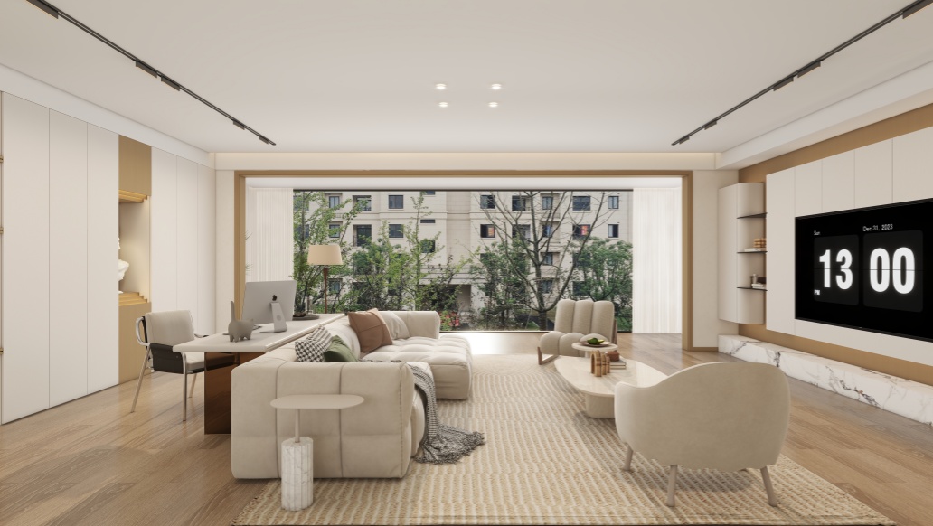 門墻柜系統(tǒng)涵蓋板材、室內門、圓弧、實木格柵、埡口、門套線、踢腳線,打通23款花色,材質、色彩統(tǒng)一,實現(xiàn)門墻柜全屋同色一體。