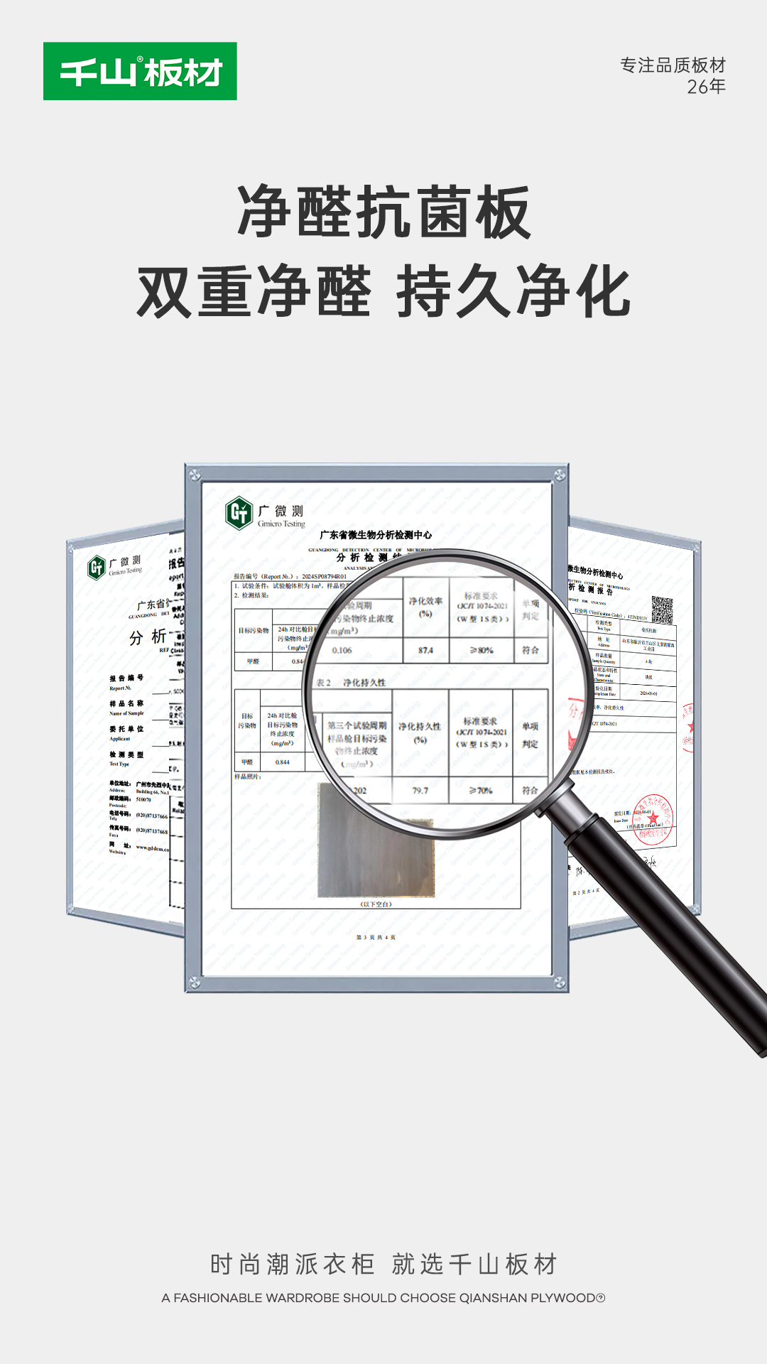 經(jīng)權威機構檢測,凈醛板24h甲醛凈化效率為87.4%,凈化持久性達79.7%,抗(細)菌率、抗病毒活性率>99.99%,減少疾病傳播風險,為生活筑起免疫屏障。