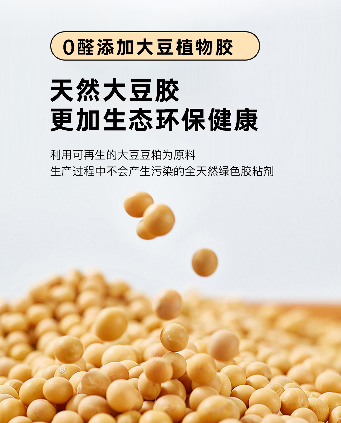 千山大豆膠板材利用大豆分子改性技術(shù),解決傳統(tǒng)大豆膠的耐水性、膠合性缺陷,具有更好地粘合性能,提升了板材的膠合強(qiáng)度、耐水性及靜曲強(qiáng)度,保證板材的抗變形、防潮防霉、不易老化性能,延長使用壽命。