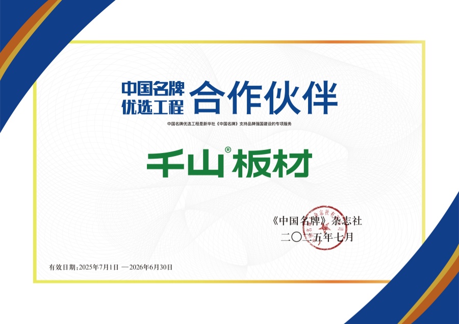 權(quán)威媒體平臺背書,品牌賦能!2025年7月,千山板材與新華社《中國名牌》達(dá)成戰(zhàn)略合作,成功成為中國名牌優(yōu)選工程合作伙伴。