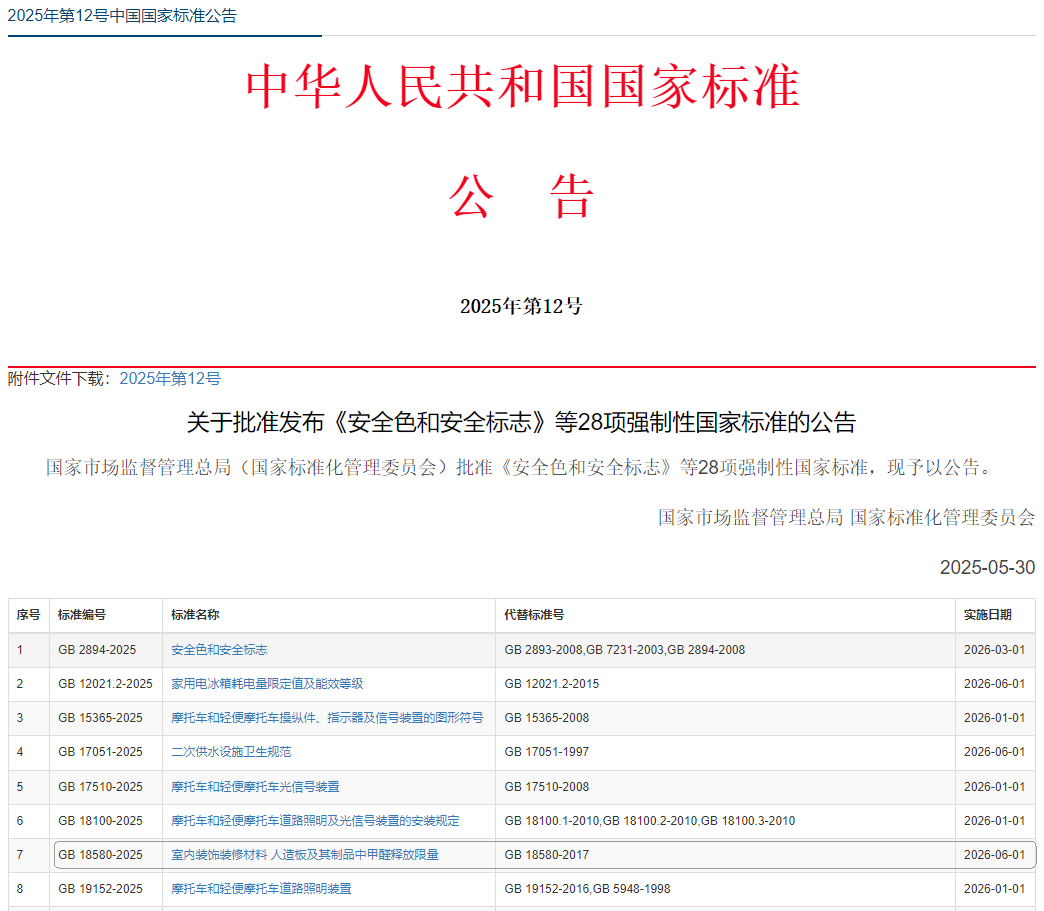 2025年5月30日,強制性國家標(biāo)準(zhǔn)GB 18580-2025《室內(nèi)裝飾裝修材料 人造板及其制品中甲醛釋放限量》正式發(fā)布,定于2026年6月1日正式實施,替代已經(jīng)實行8年的GB 18580-2017標(biāo)準(zhǔn)。